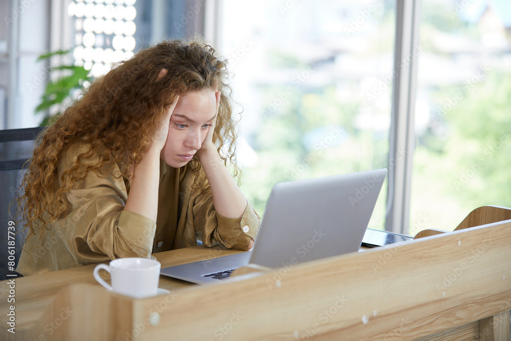 young woman working on laptop computer and feeling tired and worry from hard work in the office