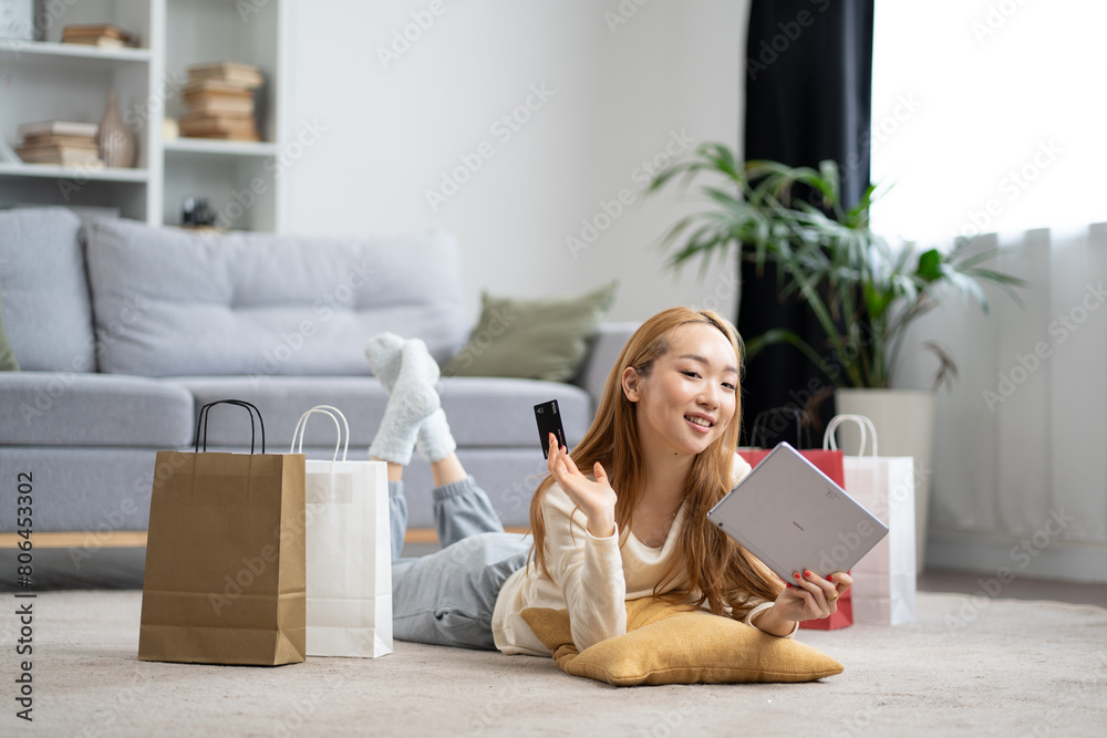 Young Woman Enjoying Online Shopping From Home, Smiling at Smartphone While Surrounded by Shopping Bags and Holding Tablet.