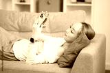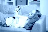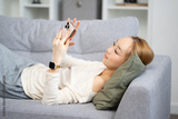 Young Woman Relaxing On Sofa With Smartphone, Enjoying Leisure Time At Home, Comfort And Technology Concept