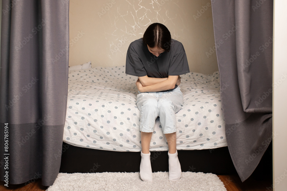 teenager has abdominal pain, female teen clutching her belly in agony, illness in teenage girl