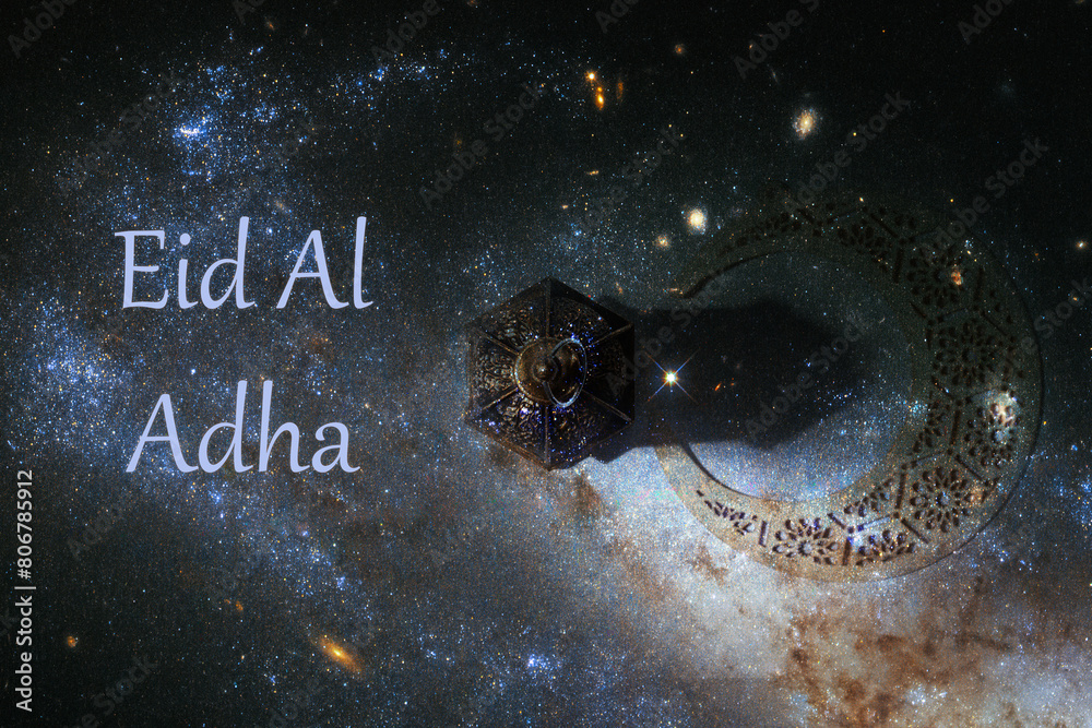 Eid al Adha, traditional Arabic lantern on the background of the star sky, Religious festival celebration, fasting and praying under the crescent moon,Element of the image provided by NASA
