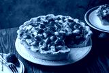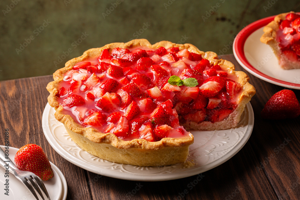 Homemade Strawberry jello pie on a brown wooden table. Baked crust pie with No-bake filling. Lots of fresh strawberry and strawberry gelatin made with gelatin and cornstarch.