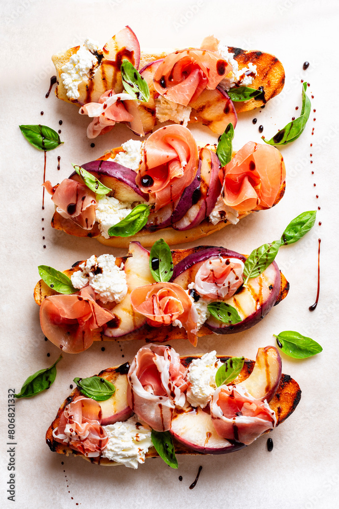A griddled peach, parma ham or prosciuto, bread, and robiola cheese open sandwich, with balsamic vinegar and basil. Food background. Top view, vertical image.