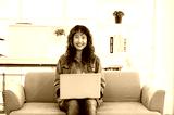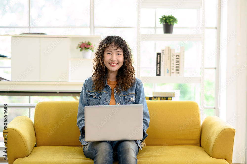 Portrait of attractive young Asian female graphic designer looking at the camera while working with laptop computer sitting on office cozy sofa.