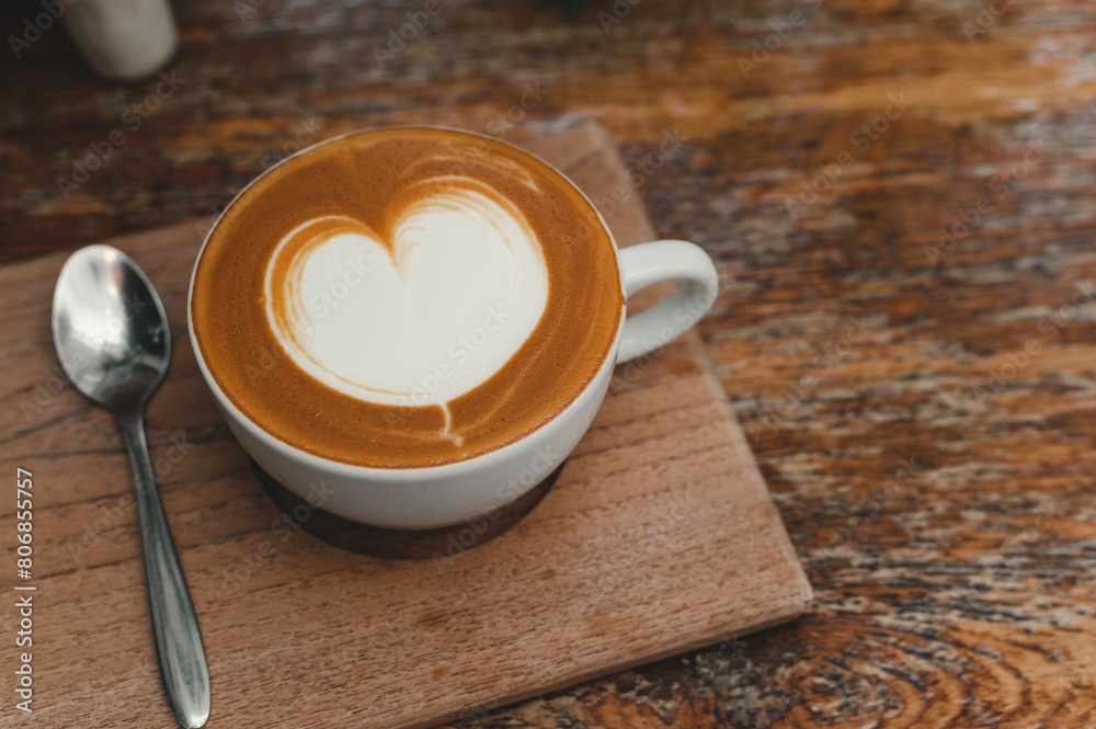 Top view of Hot coffee in white cup with coffee spoon on wooden tray. Copy space.