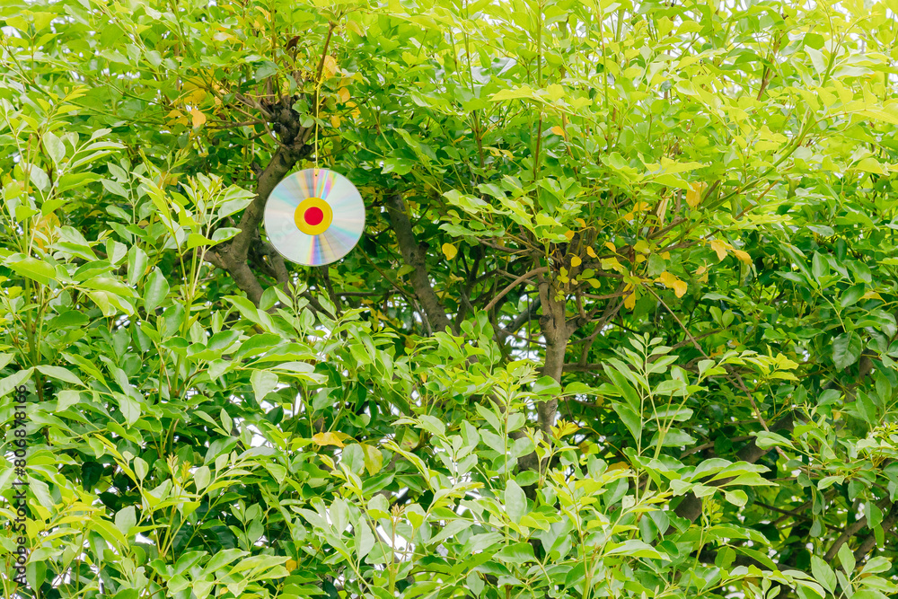 鳥よけのCDをぶら下げたシマトネリコ