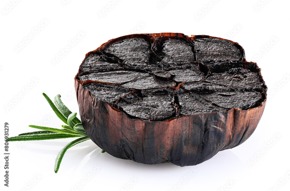 Half bulb of black garlic and rosemary isolated on white background. With clipping path.