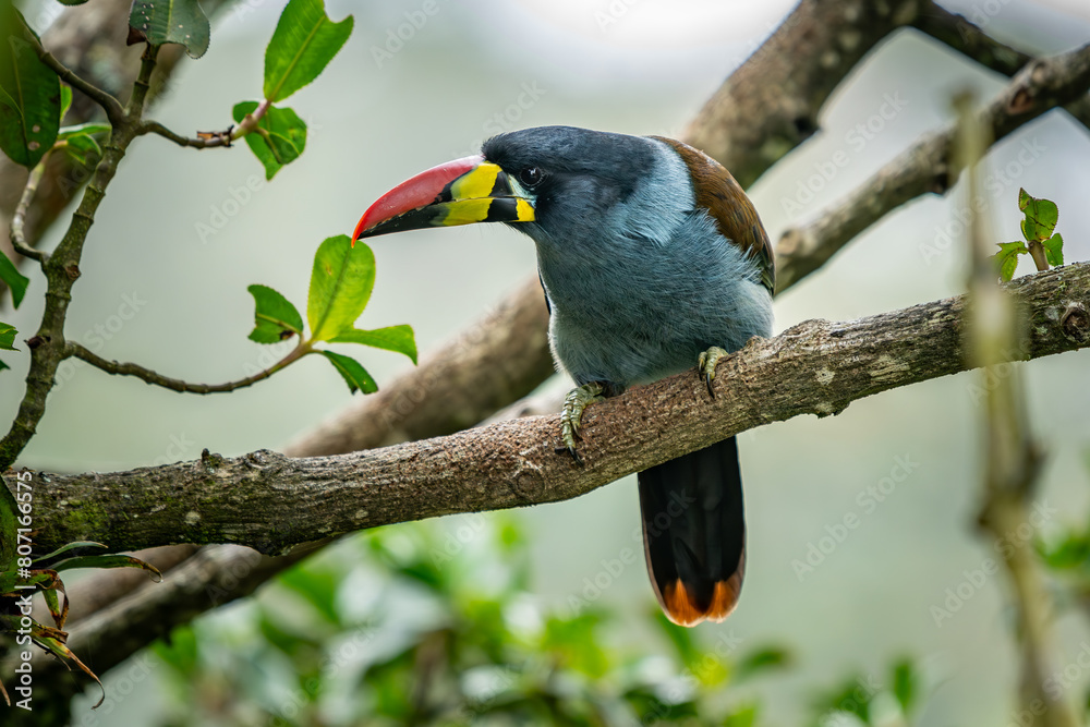 beautiful colored plate-billed mountain toucan (Andigena laminirostris) sitting n the branch very near in the cloud forest