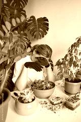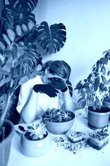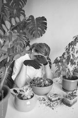 In a cozy room, a sad woman tends to her beloved plants with care, creating a green oasis in her home. Her happy demeanor reflects her love for gardening, making balcony a cheerful haven