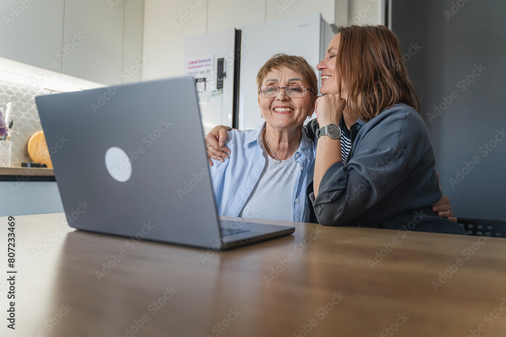 Portrait of young woman teaching senior mother using laptop and internet at home