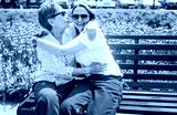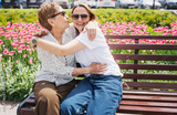 Happy smiling young daughter with senior mother sitting on park bench and hugging, mother day concept