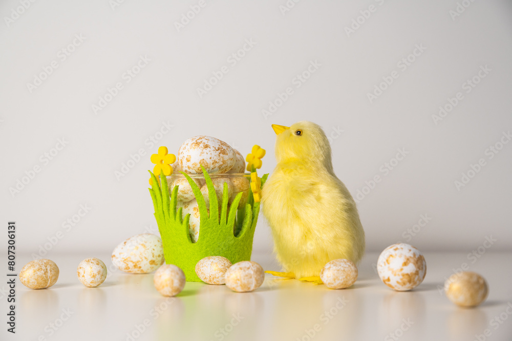 Spring greetings banner with chickens and flowers, easter celebration