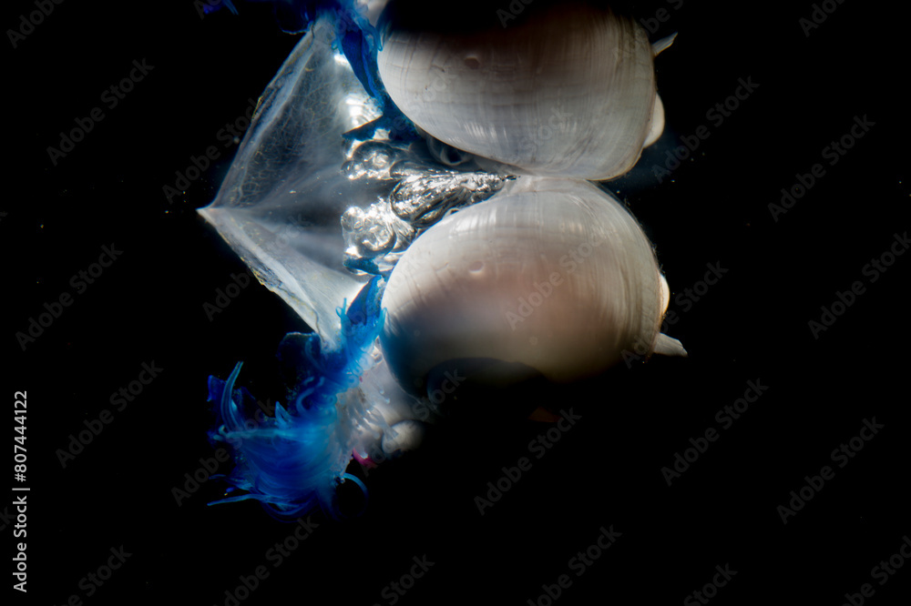 Violet sea snail Janthina janthina , with bubble raft, on St. Peter's boat (Velella velella Linnaeus, 1758). Porto Ferro, Sassari, Italy