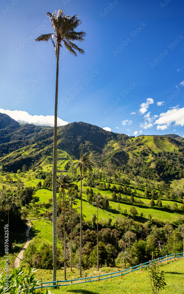 Andean wax palms, Ceroxylon, genus of plants in family Arecaceae. Nature landscape of tall wax palm trees in Valle del Cocora Valley. Salento, Quindio department. Colombia mountains landscape.