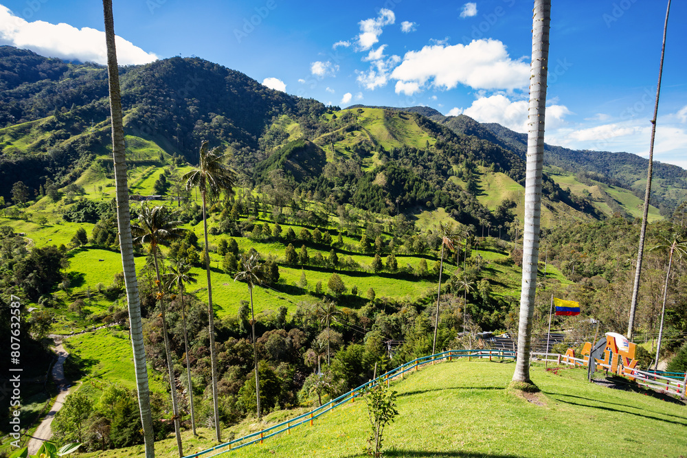 Andean wax palms, Ceroxylon, genus of plants in family Arecaceae. Nature landscape of tall wax palm trees in Valle del Cocora Valley. Salento, Quindio department. Colombia mountains landscape.