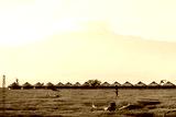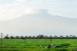 view of tent camp in the African savannah. Tents in the forest on the background of Mount Kilimanjaro in Africa