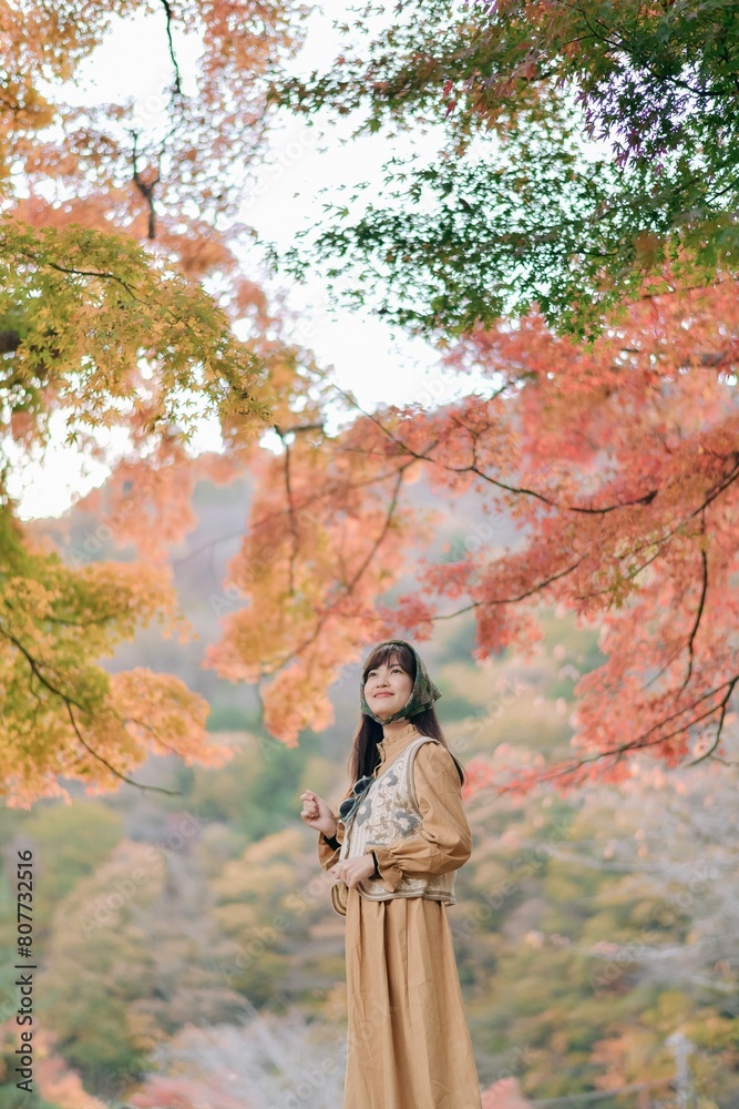 Asian woman in casual dress enjoys Japan's beauty, walking amid vibrant foliage. A cheerful holiday portrait capturing the essence of nature, fashion, and a journey.
