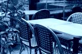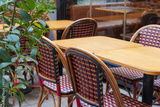 Outdoor empty restaurant terrace with potted plants tables and chairs