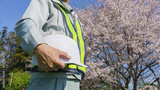 桜の花とヘルメットを持つ作業服姿の男性