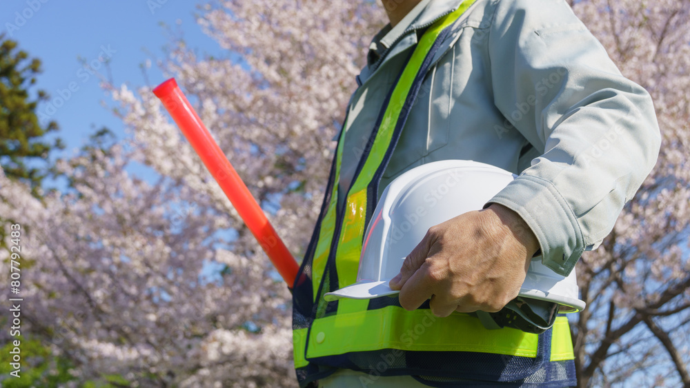 春の桜を背景に誘導棒とヘルメットを持つ作業服の男性|建設業・警備業などのイメージ
