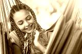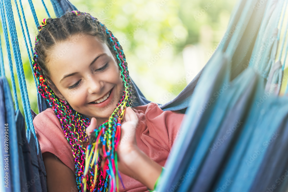 Portrait of laughing young girl with colorful braids in her hair posing on blue hammock. Horizontally.