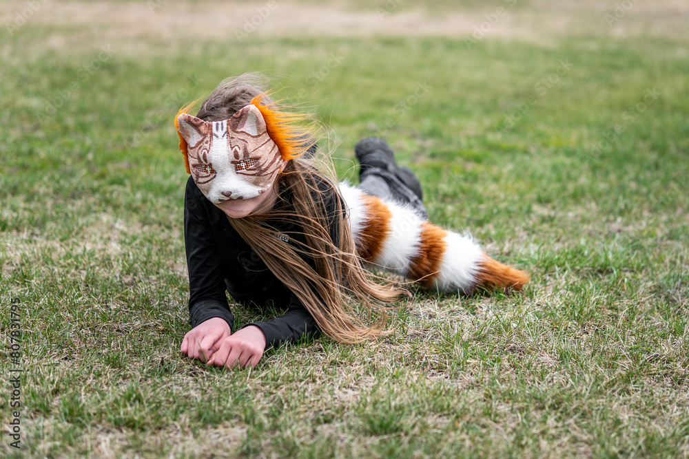 Teenage girl with cat mask and gloves doing Quadrobics. girl in a cat mask is lying on the grass.