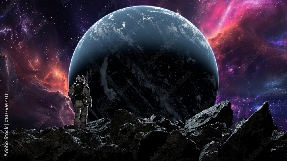 Astronaut gazes at a breathtaking celestial view with a vivid nebula and a massive planet looming ahead