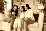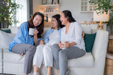 Asian woman friend group mature women meeting and sharing personal stories laughing at home while drinking coffee woman energetic women meeting and sharing personal stories in a living room warm house