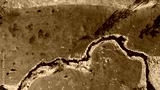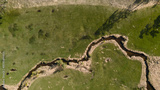 Small narrow winding river, green fields and forest aerial view. Green beautiful rural drone landscape in sunset light. Nature, sustainable and ecology concept. Crni Rzav river, Zlatibor, Serbia.