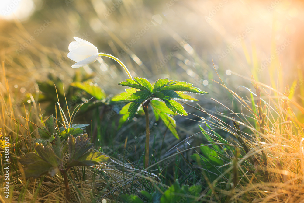 Macro view of wild white flower in sunshine.