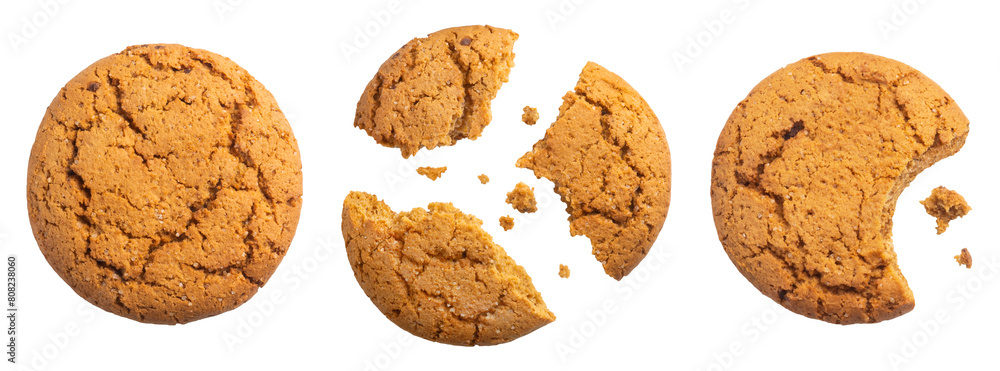 Cookies isolated set. Whole oatmeal cookies and broken pieces on a transparent background, top view.