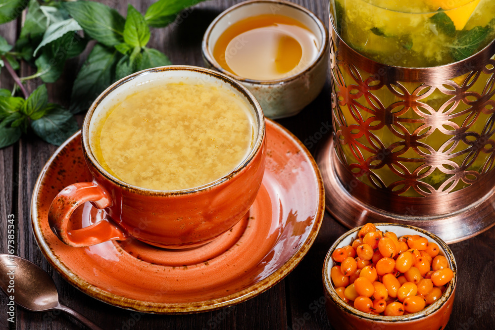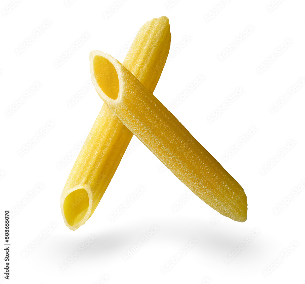 Two pieces of uncooked italian pasta penne rigate over white background closeup