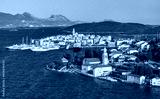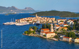 AERIAL: Scenic shot of the picturesque town of Korcula on a sunny summer day.