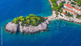 AERIAL: Flying above a sandy beach in Korcula with recliners facing the sea.
