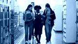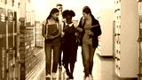 Teen, group and walking in hallway of school, shock and surprise with news in phone, student and smile. Highschool, girls and reading of message or text on mobile, kids and invitation to prom