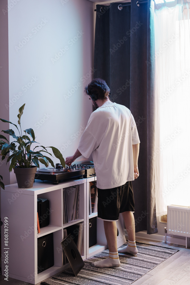 Back view of a person using a turntable in a well-lit, comfortable interior.
