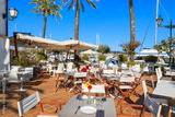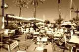 Restaurant tables in Alcudia town, Majorca island, Spain