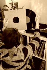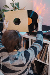 A person enjoys a nostalgic moment with a vinyl record in a cozy home setting.