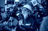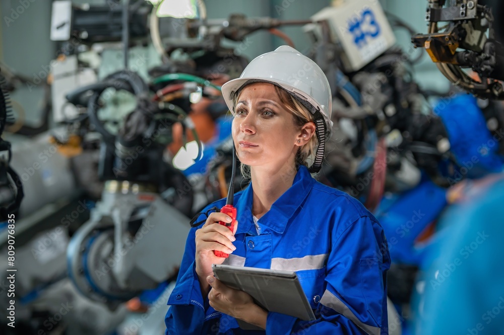 male automation engineer in uniform helmet safety inspection check control heavy machine robot arm system in industrial factory. technician worker check for repair factory machine