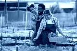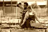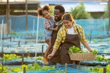 Happy farmer parents dad father with daughter child on piggyback walking fun with mum in garden greenhouse. Black skin dad carry neck riding daughter in vegetable greenhouse garden in light sunset