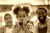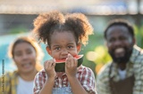 hungry african afro black daughter eat watermelon fruit with dad father teasing fun in garden greenhouse. Black african daughter afro hair enjoy eat fruit with dad in vegetable greenhouse at sunset