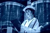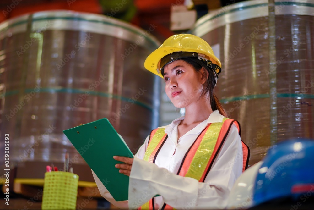 Asian woman engineer in uniform inspection warehouse and check control heavy machine construction installation in industrial factory. technician worker check for repair maintenance operation system