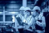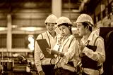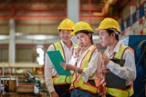 Factory apprenticeship. Header mentor teaching young employees trainee operating machine looking monitor and check Production process machinery. foreman explaining team engineer control machine