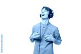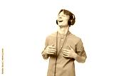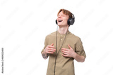 young handsome redhead man in glasses and shirt enjoying playlist in headphones
