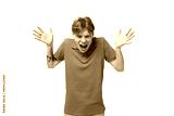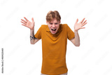 a young frustrated guy with short red hair dressed in a summer orange T-shirt is shouting with his hands up