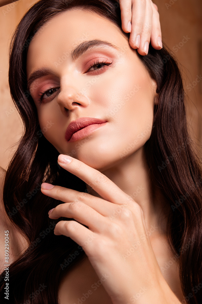 Photo of brunette hair girl touch face look in camera isolated wooden wood background