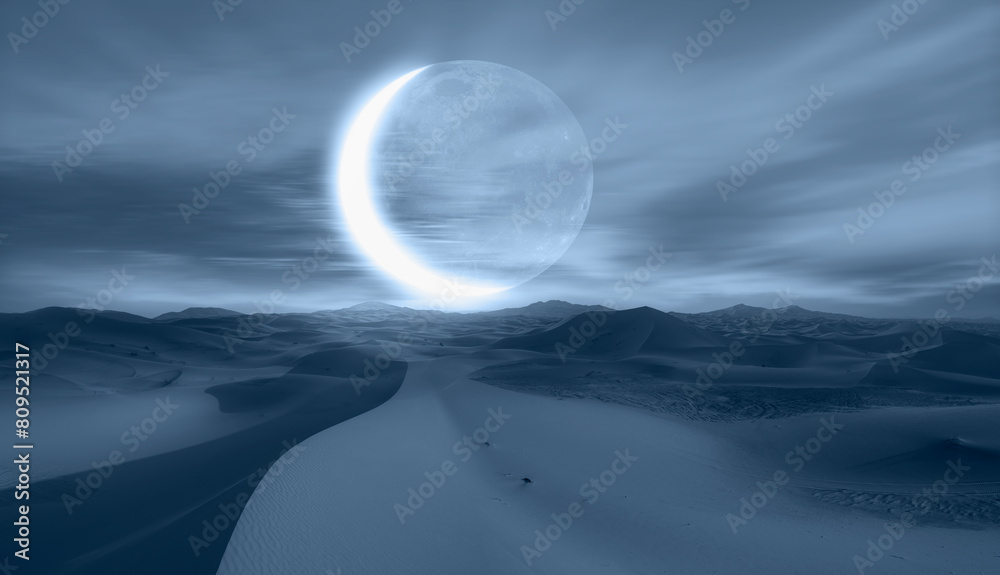 Night sky with crescent moon in the clouds on the foreground hot desert (sand dune) "Elements of this image furnished by NASA