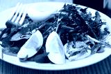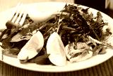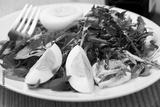 Fresh spring green dandelion salad with eggs on a plate closeup