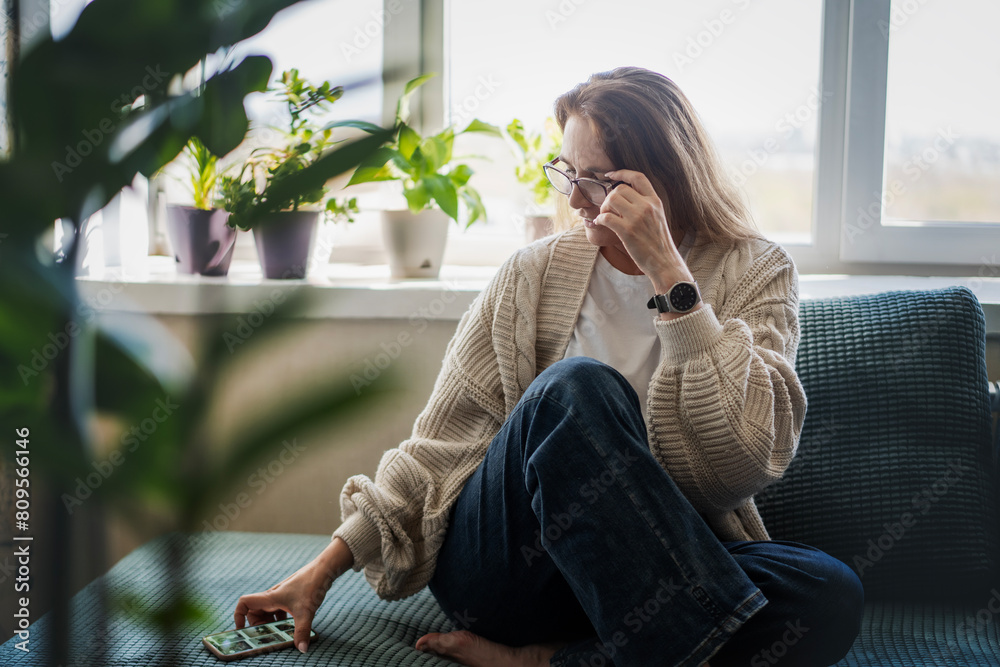 Caucasian attractive mature middle aged woman sitting on the couch at home using smartphone