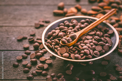 Bittersweet dark chocolate drops with cocoa beans, sugar-free couverture, baking and cooking ingredient